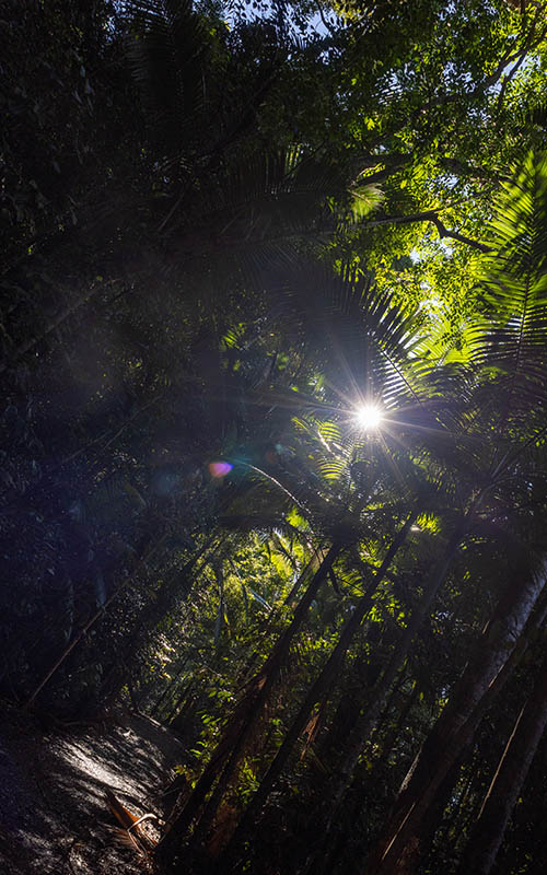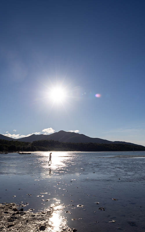 Der Wanderweg führte durch den Regenwald. Hier war es dank der hohen Bäume schattig und somit halbwegs erträglich von den Temperaturen. Leider war der Weg nicht so spannend wie unsere bisherigen Regenwald-Exkursionen. Man konnte abseits des Weges leider nichts sehen, da alles so dicht zugewachsen war. Nach einer halben Stunde bergab beschlossen wir, den Rückweg anzutreten. Der komplette Wanderpfad hätte laut Schild 4,5 Stunden gedauert und dafür war es uns heute wirklich zu heiß. Auf dem Rückweg bergauf kamen wir ziemlich ins Schwitzen und waren froh, als wir zurück am Auto waren. Wir fuhren anschließend noch zum „Dingo Beach“. Hier herrschte gerade Ebbe und so konnten wir über 30 Meter hinaus aufs nicht vorhandene Meer laufen.