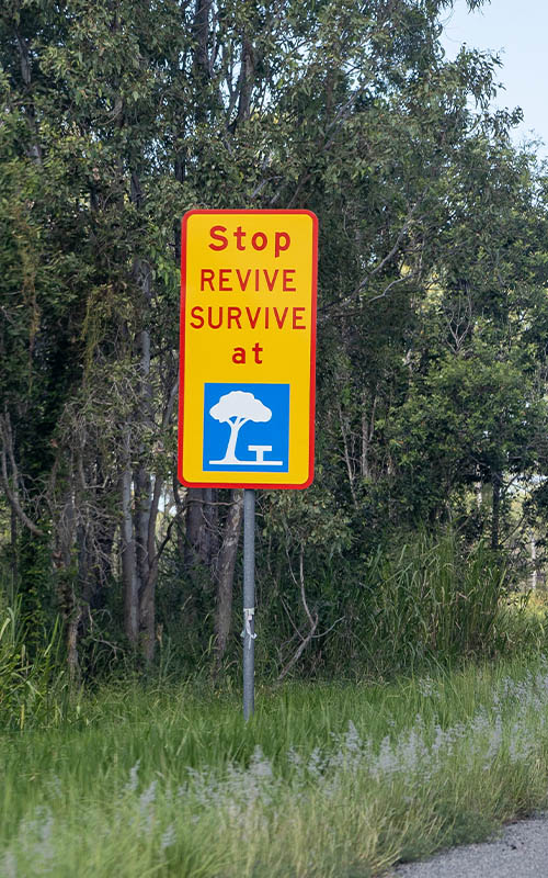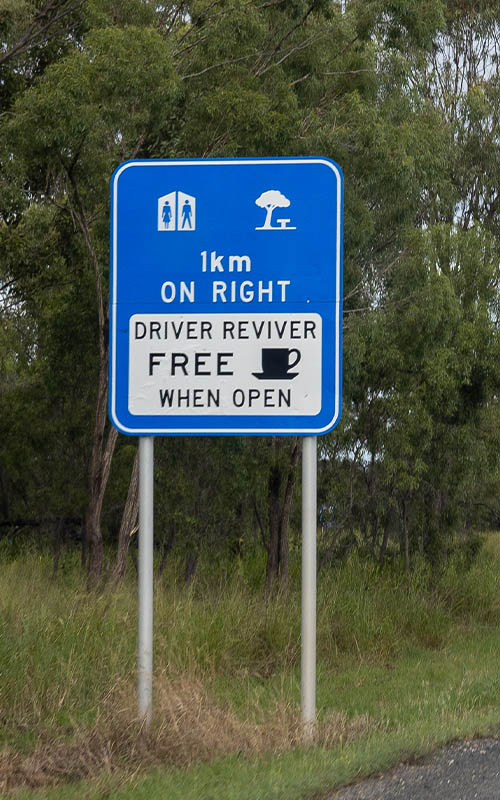 Zu unserem nächsten Stopp Arlie Beach lagen wieder etliche Kilometer vor uns. Mittlerweile sind wir lange Fahrten ja schon gewöhnt. Dieses Land ist einfach sehr groß und man muss ganz schön Strecke machen, wenn man die ganze Ostküste sehen will. Müdigkeit ist da der größte Feind der Autofahrer. Durch Schilder wird man immer wieder dazu ermahnt, Pausen zu machen. Teilweise klingen die Sprüche etwas brutal wie: „Tired Drivers die“, „Stop revive survive“ oder „Fatigue kills“. Doch es scheint zu wirken und bei langen Streckenabschnitten ohne Raststätte nötig zu sein, immer wieder auf die Gefahren durch übermüdetes Fahren hinzuweisen. Es gibt regelmäßig Haltemöglichkeiten, um sich auszuruhen. Zusätzlich findet man immer wieder Schilder mit Quizfragen, die ein paar Kilometer später aufgelöst werden. Da bleibt man nicht nur wach, sondern lernt sogar noch was.