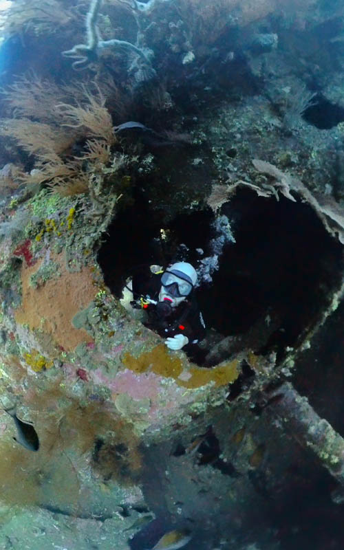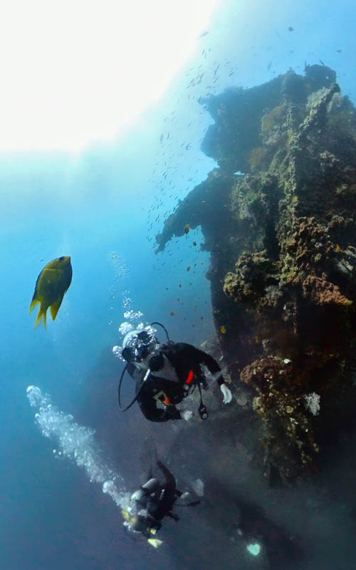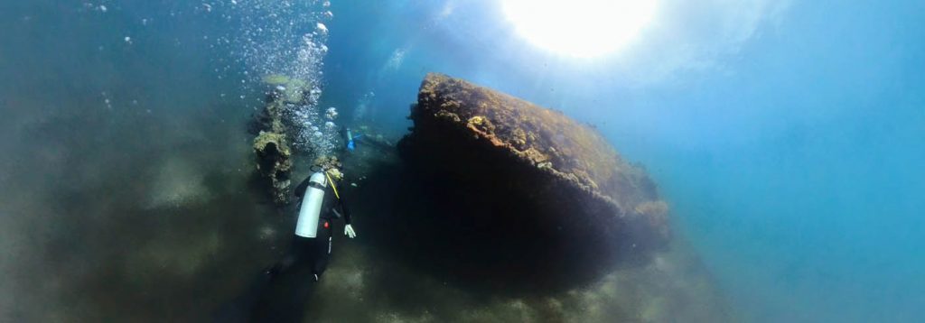 Höchste Zeit also, diesen Ort mit einer positiven Erinnerung abzuspeichern. Wir hatten einen sehr netten und entspannten Tauchlehrer aus Schweden namens Russ. Wir gingen, wie damals, vom Strand aus ins Wasser und tauchten langsam tiefer. Wie aus dem Nichts tauchte dann plötzlich das Wrack auf. Wirklich ein toller Anblick, zumal um das Wrack herum fast nur Sand und somit Einöde unter Wasser herrscht. Dieses versunkene Schiff hat ein komplettes Ökosystem mit hunderten verschiedener Arten geschaffen. Wir tauchten an einigen Stellen in das Wrack hinein und aus kleinen Öffnungen wieder heraus. Es war super toll und das erste Mal für uns. Natürlich war auch die Fischvielfalt wunderschön und bunt. Nach dem ersten Tauchgang machten wir Mittagspause und bekamen im Restaurant vor Ort etwas zu Essen. Der zweite Tauchgang führte uns nochmal zu anderen Teilen des Wracks. Wir schwammen am Steuerrad vorbei und gingen sogar bis 22 Meter Tiefe. So tief war ich bis dato auch noch nie (für den Open Water Diver geht man bis auf 18 Meter Tiefe). Wirklich ein tolles Erlebnis.