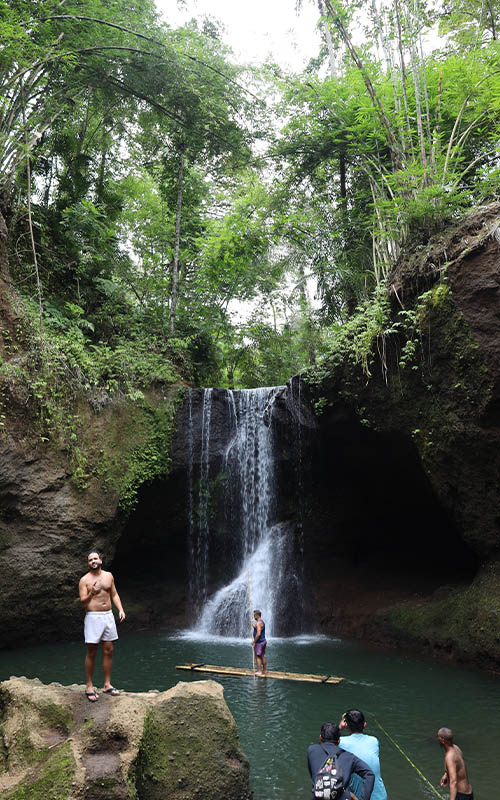Auf dem Weg zu den Wasserfällen kamen wir nochmal in einen ordentlichen Regenschauer und suchten Schutz unter einem Baum am Straßenrand. Auf Bali ist momentan Regenzeit. Das Wetter ist aber genauso schön und warm, wie im Rest des Jahres. Es regnet nur hin und wieder für ein paar Minuten. Bei über 30 Grad ist man praktischerweise aber gleich wieder trocken. Am Wasserfall angekommen stellen wir fest, dass es sich dabei mehr um einen Fotospot für Influencer handelte. Man kann sich von einem Einheimischen auf einem Bambusfloß in dem Becken vor dem Wasserfall platzieren und fotografieren lassen. Das ist nicht wirklich unser Ding. Dank der Nebensaison waren außer uns aber nur 5 andere Personen vor Ort. Viel Platz ist dort ohnehin nicht und wir wollten uns lieber nicht vorstellen, wie es dort in der Hauptreisezeit zugeht.