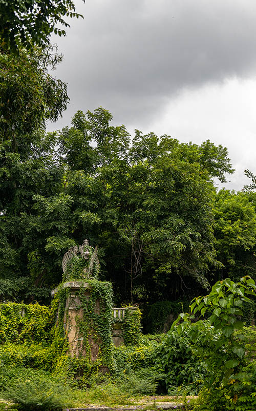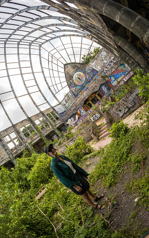 Weiter ging es zu einem tollen Lost Place auf Bali. Das sog. „Taman Festival“ ist ein verlassener Vergnügungspark, der vor vielen Jahren noch vor Fertigstellung aufgegeben wurde. Die Rohbau Fassaden sind mittlerweile von Pflanzen überwuchert und mit coolen Graffitis verziert. Ein großer leerstehender Kinosaal und mehrere kleinere Gebäude und Durchgänge gab es zu entdecken. Das nackte Stahlgerüst einer Dach Konstellation wirkte zwar schon etwas wackelig, war aber ein tolles Fotomotiv. Es regnete immer wieder für ein paar Minuten und wir fühlten uns wie im Dampfbad. Je tiefer wir ins Dickicht vordrangen, desto mehr kamen wir ins Schwitzen. Sobald wir nur kurz stehen blieben, fielen die Mücken in Scharen über uns her. Ich glaube, ich hatte noch nie so viele Mückenstiche am Stück an meinem Körper (15- 20 Stück pro Bein!). Ich hatte mich heute für einen Rock entschieden, da es deutlich über 30 Grad hatte. Nach dem Rundgang durch die Anlage sahen meine Beine aus, als hätte ich zwischenzeitlich die Beulenpest bekommen.