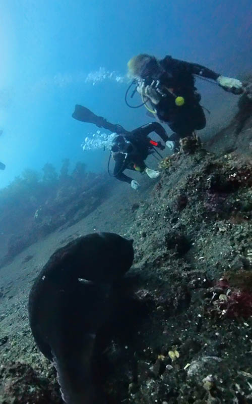 Heute war Tauchen angesagt. Für uns ein besonderer Tag, denn hier auf Bali haben wir vor 6 Jahren unseren Open Water Diver gemacht. Hier hat unsere Liebe zum Tauchsport ihren Anfang genommen. Wir konnten es uns natürlich nicht nehmen lassen, unseren Tauchgang bei der Tauchschule von damals zu buchen. Dafür mussten wir wieder einmal früh aufstehen, denn eine lange Fahrt zum Tauchspot stand uns bevor. Die Fahrt zum Tauchcenter dauerte ca. 45 Minuten. Wir dachten uns, wir sparen uns das Shuttle von der Tauchschule und fahren da morgens schnell selber hin mit unserem Roller. Eigentlich eine gute Idee. Wir mussten zwar um 5 Uhr aufstehen, aber das wäre ja nicht das erste Mal. Als wir gegen 5:30 Uhr das Zimmer verlassen wollten, regnete es. So hatten wir das nicht geplant! Wir packten also unsere Rucksäcke in Regenhüllen und uns in unsere Regenjacken. Ab auf den Roller und los ging die feuchtfröhliche Fahrt. Morgens im Dunkeln (die Sonne geht hier erst kurz vor 7 auf) bei strömendem Regen zu fahren, ist nicht so spaßig, wie es klingt. Schon nach wenigen Minuten waren wir komplett durchnässt. Immerhin mussten wir nicht frieren, denn auch morgens hat es hier schon 27 Grad. Nach 20 Minuten hörte es endlich auf zu gießen und wir konnten die restlichen 20 Minuten im Trockenen fahren. An der Tauchschule angekommen, zogen wir uns schnell um und stiegen in einen Minibus um. Wir sammelten noch ein finnisches Pärchen und einen lustigen Amerikaner in der Umgebung ein und machten uns auf den Weg zum Tauchspot. Uns standen noch einmal 2,5 Stunden Fahrt bevor. Genug Zeit, um ein bisschen zu schlafen und die nassen Klamotten zu trocknen.