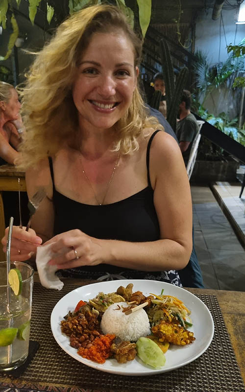 Unserem Host Kadek gehört auch ein Restaurant in der Nähe. Er bietet einen kostenlosen Shuttleservice für seine Hotelgäste an. Wir sind es wirklich nicht mehr gewöhnt, dass alles so problemlos arrangiert wird. Einen Roller haben wir dann auch ab morgen früh. Der kostet im Gegensatz zu den Philippinen (16 €) hier auch nur 5 € am Tag. Bali, du bist Balsam für unsere Seelen! Das Restaurant ist wunderschön und das Essen war auch fantastisch. Hierher kommen wir die nächsten Tage definitiv wieder zum Essen. Wir trafen vor Ort auf unseren Gastgeber, der uns seiner Frau vorstellte, die sich nochmal persönlich bei uns bedankte, dass wir in ihrer Unterkunft übernachten und ins Restaurant gekommen sind. Wir kommen aus dem Schwärmen und Grinsen gar nicht mehr heraus und sind sehr glücklich. Damit endete ein ganz toller Tag für uns, der uns schon jetzt für die letzten 22 Tage entschädigt hat. Danke Bali! Genau das haben wir gebraucht.