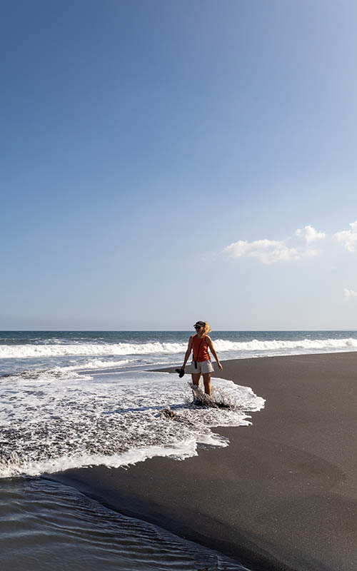 Der Sand ist hier schwarz und glitzert toll in der Sonne. Hier war, außer ein paar einheimischen Fischern und Surfern, niemand unterwegs. Wir haben einen ausgiebigen Spaziergang gemacht, mit Clarice gespielt und ihr zugesehen, wie sie versucht hat, kleine Krebse zu fangen. Ein wirklich schöner Start in unseren Bali Aufenthalt. Anschließend sind wir noch zu einem nahegelegenen Supermarkt gelaufen, um Getränke zu kaufen.