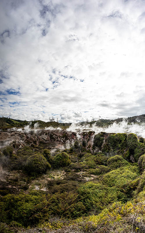 Die Krater, Dampfwolken und seltsam geformten Pflanzen und Moose an den Austrittsöffnungen versetzten uns ein bisschen in eine andere Welt. Wir hatten eine schöne einstündige Wanderung durch das Thermalfeld und auf eine kleine Anhöhe.