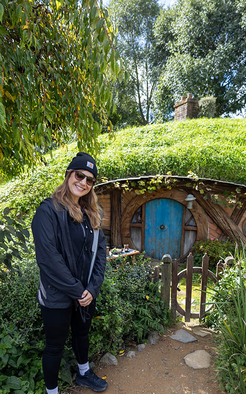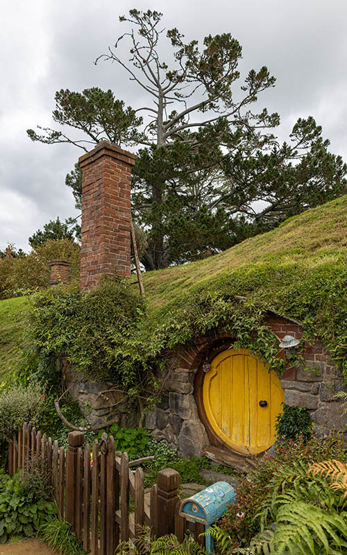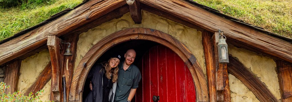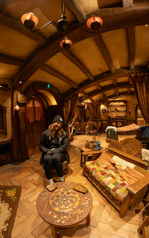 Auf Wäscheleinen flattern kleine Kleidungsstücke im Wind, in den Vorgärten stehen Tische und Stühle bestückt mit Speisen, Schachspielen oder einem Hinweis auf den jeweiligen Beruf des Hobbits (z.B. Fischer oder Imker) und in den Gärten wachsen echte Kürbisse und Obstbäume. Aus einem der Schornsteine steigt sogar Rauch. Am kleinen Teich steckt noch eine Angel im Boden, die aussieht, als hätte sie jemand dort vergessen. Man erwartet fast, dass jeden Moment ein Hobbit um die Ecke kommt. Einfach toll. Der Rundgang ist geführt und man erfährt jede Menge toller Details zu den Filmen und den Kulissen. So sind z.B. die Hobbithöhlen in verschiedenen Größen gefertigt, um sie passend zu den Figuren (Mensch oder Hobbit) im richtigen Maßstab klein oder groß aussehen zu lassen. Natürlich besucht man auch das Zuhause von Frodo und Bilbo Beutlin. Hier kann man sich vor der berühmten grünen Tür fotografieren lassen. Wer möchte nicht eine der runden Türen aufmachen und hinein gehen? Anscheinend wünschte sich das jeder Besucher des Filmsets in den letzten Jahren. Dieser Wunsch ist im Dezember 2023 in Erfüllung gegangen. In Zusammenarbeit mit den Ausstattern der Filmreihen wurden zusätzlich noch zwei begehbare Hobbithöhlen gebaut.