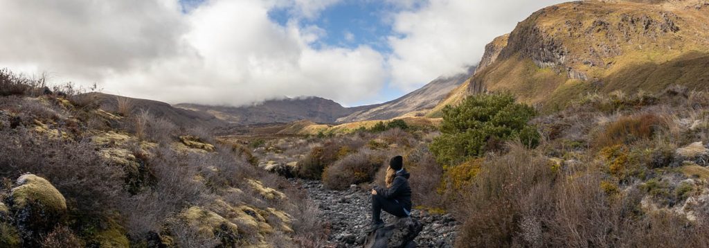 Die beste Route durch den Park bietet laut Wanderbegeisterten der „Tongariro Alpine Crossing“. Diese Wanderung führt bis hoch zu einem der Vulkane, ist knapp 20 km lang und dauert ganze 9 Stunden! Sie ist als schwieriger Track für erfahrene Wanderer ausgeschrieben. Da fühlten wir uns erstmal nicht angesprochen. Zusätzlich schreckte uns noch eine Voranmeldung für einen Parkplatz und eine Shuttle Buchung ab. Das Shuttle bringt die Wanderer für 60 Euro pro Person vom Parkplatz zum Startpunkt und holt sie am Ziel auch wieder ab. Dabei muss man Start und Abholzeit vorab online angeben und buchen. Damit ist der eigentlich kostenlose Nationalpark gar nicht mehr so günstig und nicht einfach spontan zu besuchen. Wir entschieden uns gegen die Marathon Tour (wir hätten nicht mal die Ausrüstung, geschweige denn Kondition) und fuhren einfach auf gut Glück zum Besucherparkplatz.