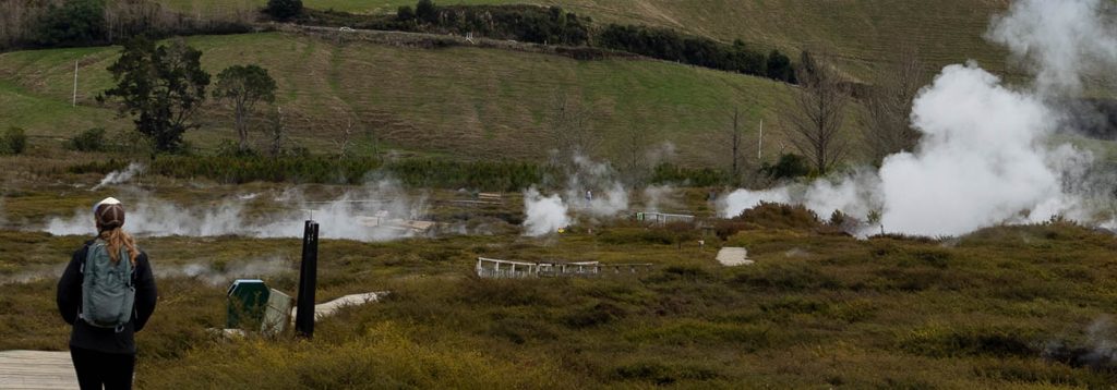 Heute gab es keinen Regen und so haben wir uns zu den „Craters of the Moon“ aufgemacht. Dabei handelt es sich um eine Region mit geothermischen Aktivitäten in der Taupo Region. Die Geothermie wird hier auch in einigen Kraftwerken zur Energiegewinnung genutzt. Auf einem großen Feld mit angelegten Wanderwegen kann man die Hitze und Gase aus nächster Nähe erleben. Dank vulkanischer Aktivität und dünner Erdkruste in diesem Teil Neuseelands sprudeln Dampf und Wasser aus den Tiefen der Erde. Es riecht etwas schwefelig und hat uns sehr an unseren Besuch der Jigokudani Quellen in Sapporo erinnert. Glücklicherweise war das Wetter heute bedeutend besser als damals 🙂
