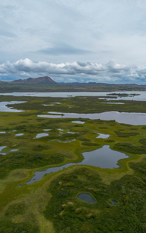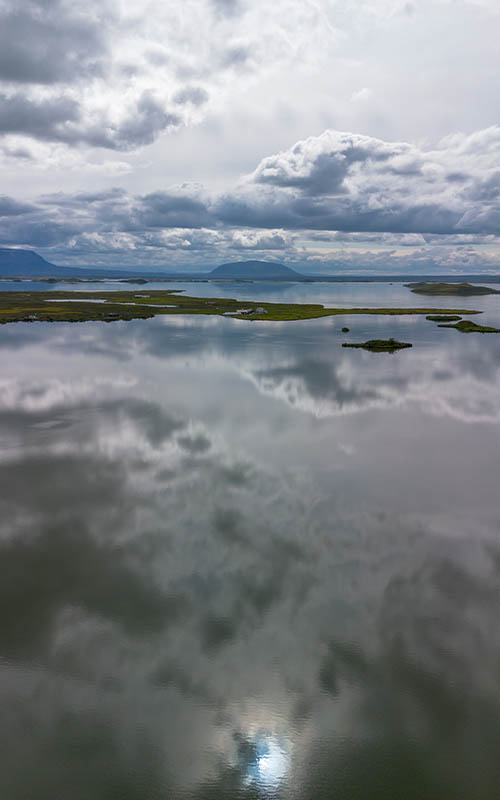 Heute war das Wetter wieder auf unserer Seite und wir setzten bei Windstille und Sonnenschein auf das Festland über. Bei der Überfahrt sahen wir sogar einen kleinen Wal in einiger Entfernung vorbeischwimmen! Ein super Start in den Tag! Vom Parkplatz aus starteten wir unseren heutigen Ausflug nach „Krafla“. Die Landschaft sieht wieder ganz anders aus, als wir sie bisher gesehen haben. Es gibt weniger Geröllfelder und mehr Grasflächen. Hier entdeckten wir auch endlich die ersten Kühe auf Island. Wir hatten uns schon gefragt, wo die Milch für den berühmten isländischen Skyr herkommt. Unseren ersten Halt machten wir am See „Myvatn“, der übersetzt soviel wie Mückensee bedeutet. Den Namen kann man definitiv wörtlich nehmen! So viele Mosquitos haben wir noch nie gesehen. Riesige Schwärme der kleinen Biester hüllten uns regelrecht ein, sobald wir das Auto verließen. Da half nur Autan und in Bewegung bleiben. Glücklicherweise waren die Mücken nicht so stechfreudig wie wir befürchtet hatten. Wir flüchteten uns in ein kleines Cafe am See, in dem vor Allem Vogelbeobachter auf ihre Kosten kommen.