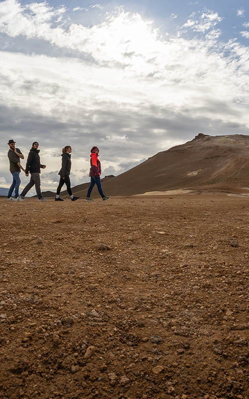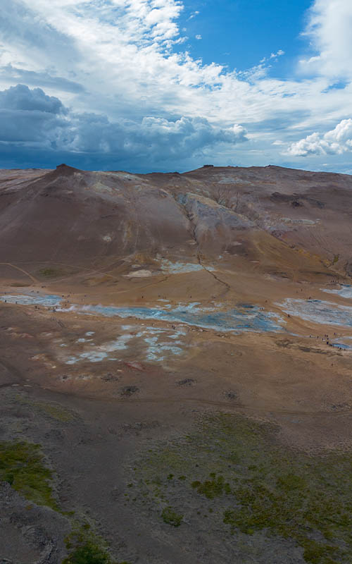 Das Solfatarenfeld „Namaskard“ im Kraflagebiet war unser nächstes Ziel. Hier dampft und brodelt es aus der Erde. Die konzentrierte Schwefelsäure hat das Gestein stellenweise verflüssigt und sorgt dort für permanenten Rauch und den typischen Gestank nach faulen Eiern. Optisch denkt man, man würde sich auf einem anderen Planeten befinden. So stelle ich es mir auf dem Mars vor. Rötlicher felsiger Boden, auf dem keine einzige Pflanze wächst. Die Schwefelquellen schimmern in einem bläulich grauen Ton und wirkten fast unecht. Auf dem großflächigen Feld konnten wir an den verschiedenen Quellen und Löchern, aus denen heißer Dampf austrat, vorbeilaufen. Ein wirkliche spektakuläre Landschaft, die besonders aus der Luft unglaublich aussah. Dank des durchgehenden Sonnenscheins kamen die Farben besonders gut zur Geltung. Ein schöner Ausflug der uns wieder einmal eine neue Seite von Island gezeigt hat. Auf dem Heimweg kauften wir noch im Supermarkt ein, bevor wir zurück auf die Insel schipperten. Unsere Unterkunft ist mit einem Grill ausgestattet, auf dem wir unser heutiges Abendessen zubereiteten und einen schönen Abend zusammen verbrachten.