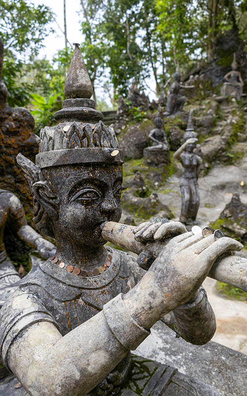 Danach sind wir noch weiter zum „Tarnim & Magic Garden“ gefahren. Ein kleiner Park mit einem kleinen Wasserfall und Flusslauf durch das Areal. Links und rechts davon gab es mehrere Pfade und kleine Häuser zu erkunden. Dazwischen standen jede Menge steinerne Figuren. Von weiblichen Tänzerinnen, über Schildkröten, oder übergroße Vögel, gab es dort so Einiges zu sehen. Wir machten ein paar Fotos und sind dann mit unserem Roller wieder heimwärts gefahren. Die Fahrt bergab fühlte sich für mich wie Sport an. Da es ziemlich steil war und ich Chris nicht mit meinem Gewicht vom Roller schieben wollte, stemmte ich mich so gut es ging mit den Beinen auf die Fußstützen, hielt mich mit beiden Händen hinten am Roller fest und lehnte mich zurück, um nicht immer weiter nach vorne zu rutschen. Ganz schön anstrengend auch für Chris, der permanent die Handbremsen drücken musste. Zumindest funktionieren die an unserem Roller einwandfrei 🙂