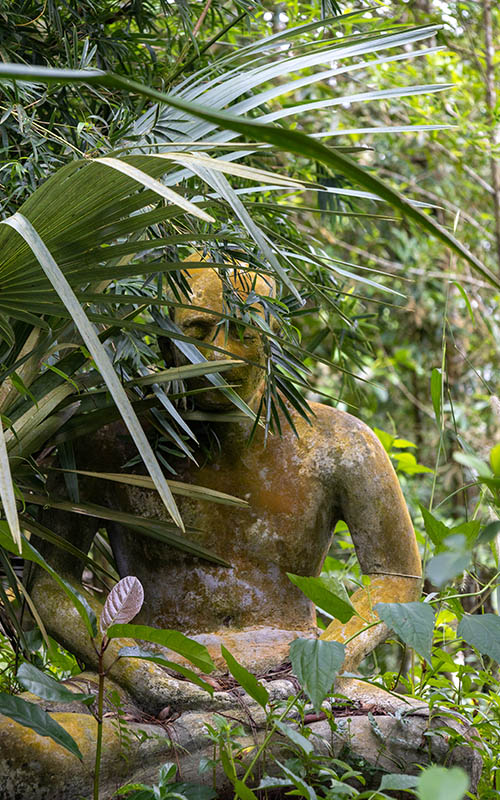 Weiter ging es den Berg hinauf zu einem Lost Place. Über steinerne Treppenstufen gelangte man auf eine Art Anlage mit mehreren Terassen, einem Pavillon und einer kleinen leerstehenden Hütte. Vermutlich wurde all das einmal als Unterkunft für Touristen gebaut und nie ganz fertiggestellt. Zwischen den Wegen entdeckten wir immer wieder Figuren, die mittlerweile von Moos überwuchert und von den umliegenden Pflanzen langsam verschluckt wurden. Eine coole Entdeckung, die Chris dank einer Google Rezension online gefunden hatte.