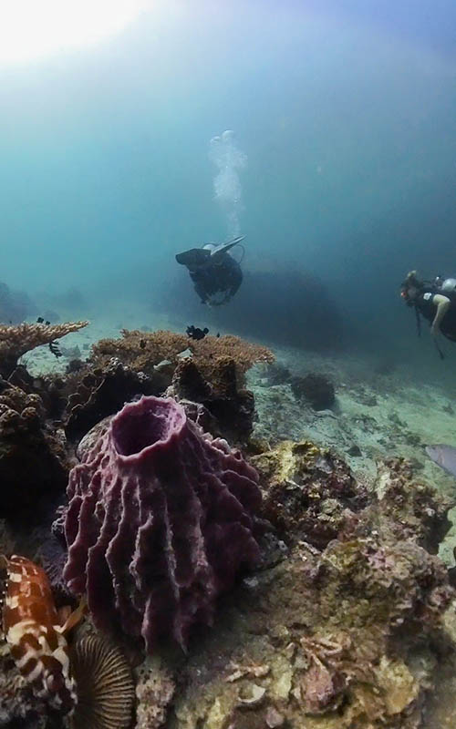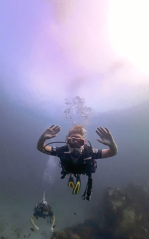 Unser 2. Tauchtag startete auch wieder recht früh. Kurz nach 7 Uhr trafen wir uns am Pier und kletterten auf das Boot. Nach einer kurzen Fahrt kamen wir bei unseren Tauchspots “Twin Rocks” & “White Rock” an. Heute lief die Vorbereitung und das Anlegen der Ausrüstung schon deutlich routinierter ab. Wahnsinn, wie schnell man die Handgriffe wieder drauf hat. Unser heutiger Tauchguide Maks war sehr entspannt und gut drauf. Unter Wasser wartete wieder eine wunderschöne Korallenwelt auf uns. Leider war die Sicht nicht so gut wie am Vortag und wir konnten erst ab 1,5 – 2 Metern richtig erkennen, was um uns herum passierte. Trotzdem war es natürlich wieder wunderschön und spannend. Maks hatte eine Taschenlampe dabei und leuchtete für uns auf die interessantesten Fische. Wir beobachteten einen großen Drückerfisch, wie er eine riesige Muschel vom Boden anhob. Darunter versteckte sich ein Seeigel, den er fressen wollte. Gekonnt packte der Fisch das Tier an einem der Stachel und drehte ihn auf den Rücken. Die Unterseite der Seeigel ist ungeschützt und so konnte ihn der Fisch erlegen. Unglaublich, wenn man etwas, das man nur aus Dokumentationen kennt, plötzlich selbst erlebt.