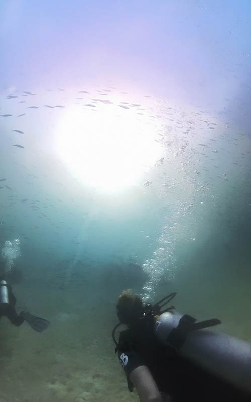 Bei unserem ersten Tauchgang gab es verschiedene Figuren auf dem Meeresboden zu erforschen. Auch freistehende Ringe, durch die man durchtauchen konnte und jede Menge anderer lustiger Skulpturen. Beim zweiten Tauchgang hatte ich ein wenig Probleme mit dem rechten Ohr beim Druckausgleich. Glücklicherweise ging es nach einem kurzen Moment auch wieder weg und ich konnte tiefer tauchen. Wir entdeckten neben den Fischen, die wir auch am Vortag schon gesehen hatten, noch eine Babymuräne und ein großer Schwarm Baracudas schwamm an uns vorbei!