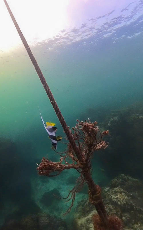Schon nach kurzer Zeit waren wir wieder drin und fühlten uns unter Wasser wohl. Besonders für mich waren die Tauchgänge heute viel entspannter und nicht so anstrengend wie ich sie von damals auf Bali in Erinnerung hatte. Ich hatte vor 5 Jahren ziemlich mit dem Druckausgleich zu kämpfen. Das war heute glücklicherweise überhaupt nicht der Fall und ich konnte die wunderschönen Korallen und Fische in vollen Zügen genießen. Wir fuhren mit dem Boot raus und starteten in der Nähe eines Strandes. Dort tauchten wir dann über mehrere Korallenbänke. Der Tauchspot nennt sich „Japanese Gardens“. Die Korallen hatten tatsächlich etwas von Pflanzen in einem Garten. Manche waren meterhoch mit Korallenfächern an den Seiten wie Bäume, andere verzweigt oder dicht bewachsen auf Steinen. Dazwischen Röhrenwürmer in verschiedenen Formen und Farben. Mir haben am besten die die kleinen gelb- und blau gefärbten Arten gefallen. Sie sahen irgendwie plüschig aus. Sobald man näher kam und sie eine Wasserbewegung spürten zogen sie sich ganz schnell in Löcher zurück. Natürlich gab es auch jede Menge wunderschöner Fische zu bestaunen.