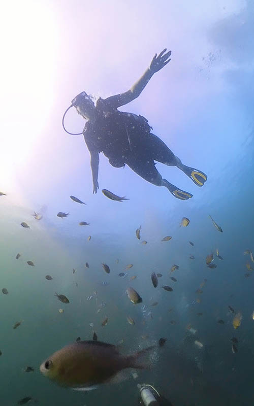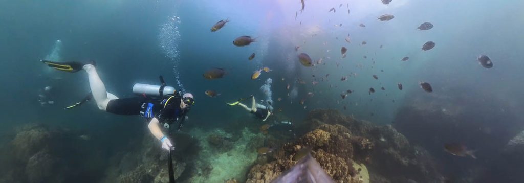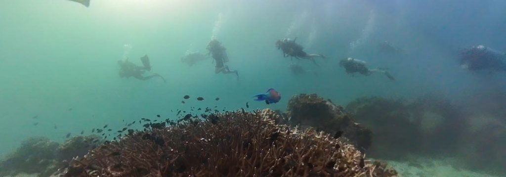 Wir haben uns von Ko Samui aus eine Tauchschule auf Ko Tao, einer der Nachbarinseln, herausgesucht. Wir wurden heute mogen um halb 7 bei unserer Unterkunft abgeholt und zum Hafen gefahren. Von dort aus ging es mit einem Highspeed Katamaran 1,5 Stunden über das Meer nach Ko Tao. Unsere Tauchschule „Scuba Birds“ bietet dort auch sog. „Rebreather“ Kurse an. In ihnen wird nochmal die Theorie in einem Fragebogen aufgefrischt und man startet im Meer im ersten Tauchgang nochmal mit den Basics. Dazu gehören die wichtigsten Handzeichen, das Anlegen und Bedienen des Equipments und die wichtigsten Übungen und Handgriffe unter Wasser. Unser Guide Natalia war super nett und hat alles nochmal mit uns in Ruhe geübt. Wir waren eine sehr kleine Gruppe von 4 Personen, die alle ungefähr gleich lange nicht mehr im Wasser waren.