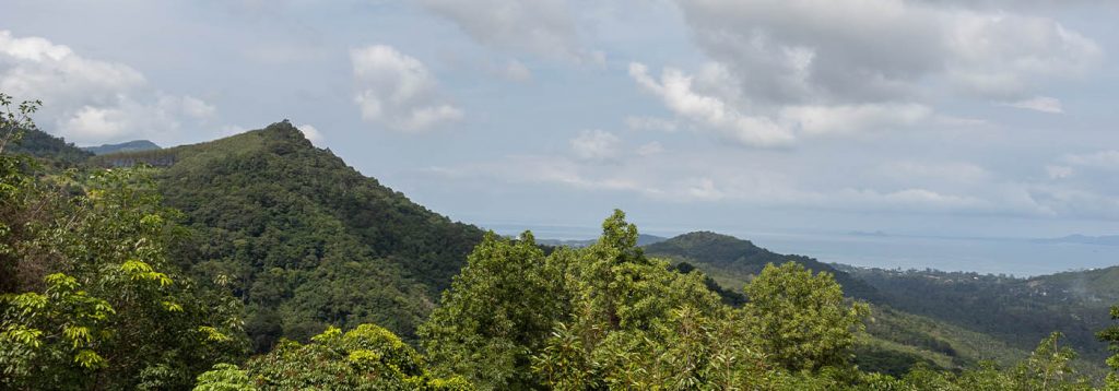 Heute gab es tagsüber mal keinen Regen, also sind wir mit unserem Roller ins Hinterland von Ko Samui gefahren und haben ein bisschen die Gegend erkundet. Der Dschungel hier ist wunderschön und voll üppiger Natur. Wir sind zu zwei Aussichtspunkten gefahren, von denen aus man über den Wald bis zum Meer blicken konnte. Leider ist es auch heute die meiste Zeit bewölkt gewesen, was sich auf den Fotos nicht so gut macht. Das Inland ist hügeliger als erwartet und so fuhren wir steile Straßen bergauf und bergab. Die Hauptstraßen sind recht gut ausgebaut. Sobald man aber auf eine der Seitenstraßen abbiegt, braucht es schon Furchtlosigkeit und Geschick, um über die von Schlaglöchern und Wurzeln übersäten Wege zu kommen. Gut, dass uns diese Art von Straßenverhältnissen nicht neu ist. Vor 100 Tagen hätte uns das vielleicht noch abgeschreckt. Mittlerweile brettern wir ohne Angst über so ziemlich jeden Untergrund. Angeblich führte uns einer der Pfade auch zu einem Wasserfall. Den haben wir leider nicht gefunden, dafür hatten wir einen schönen Ausblick und sind auf die riesige Obstplantage des Nachbarn gestolpert.