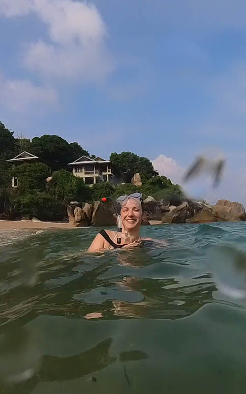 Nach unserem tollen Tauchabenteuer auf Ko Tao möchten wir gerne so schnell wie möglich wieder unter Wasser. Natürlich kostet jeder Tauchgang auch Geld. Wir haben ein bisschen recherchiert und herausgefunden, dass es auf Ko Samui auch ganz schöne Spots zum Schnorcheln gibt. Heute Vormittag sind wir also kurzerhand ins nächste Einkaufszentrum gefahren und haben uns dort zwei Schnorchelsets und einen Drybag für umgerechnet 18 Euro gekauft. Ein sehr günstiger Kauf, den wir nicht bereut haben. Anschließend sind wir zum „Coral Cave“ gefahren. Eine kleine Bucht mit Kiesstrand, ca. 15 Minuten mit dem Roller von uns entfernt.