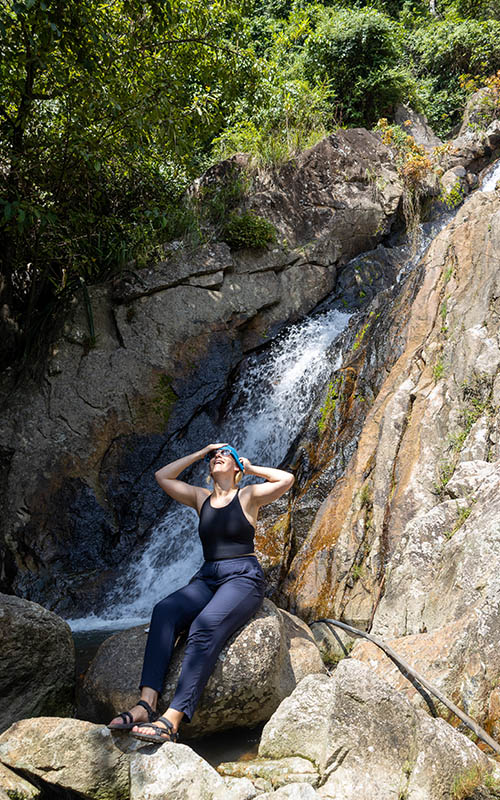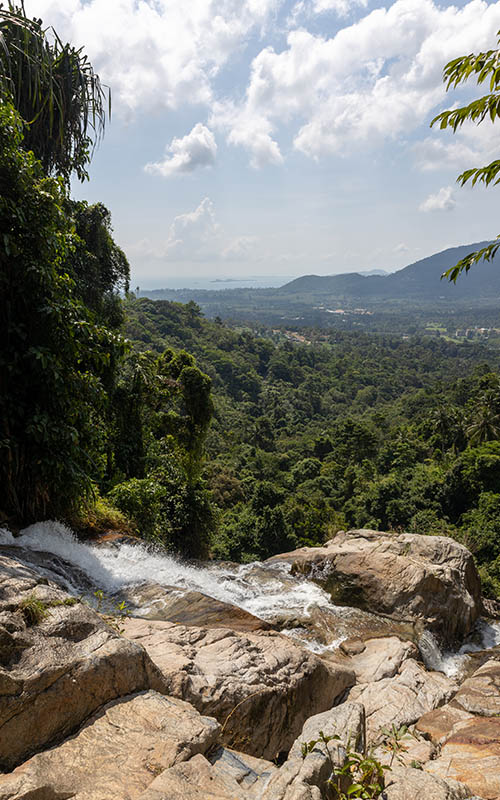 Unser letzter Tag auf Ko Samui! Heute wollten wir nochmal was erleben und sind zu den „Na Muang“ Wasserfällen gefahren. Nach einer kleinen Spritztour über die Insel parkten wir unseren Roller auf dem ausgewiesenen Parkplatz. Über wackelige selbstgebaute Holzstege und Brücken ging es im Anschluss recht steil den Berg hoch. Es gab glücklicherweise immer wieder Schilder und Hinweise Richtung Wasserfall, damit man sich im Regenwald nicht verlaufen konnte. Halteseile und hin und wieder eine angelegte Treppenstufe halfen beim Aufstieg. Nach der Hälfte der Strecke kamen wir am ersten Teil des Wasserfalls vorbei. Hier stürzte das Wasser über große Felsen in eine Art Becken. Natürlich waren auch hier schon einige Touristen vor Ort. Wir beschlossen noch weiter aufzusteigen, da sich ganz oben beim Ursprung des Wasserfalls ein „Secret Point“ befinden sollte. Wir kämpften uns also eine halbe Stunde weiter über Steine und Wurzeln den teilweise sehr steilen Weg hinauf. Der Schweiß lief uns in Strömen und es war echt anstrengend.