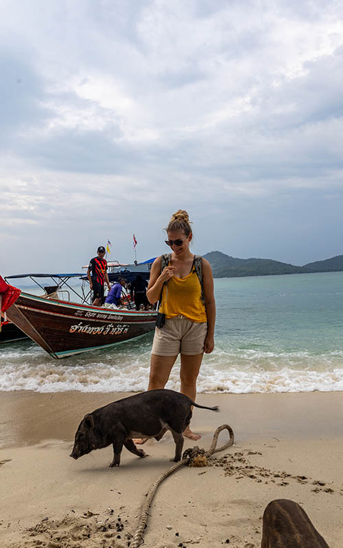 Angekommen auf der „Schweineinsel“ stellt man schnell fest, dass es sich hierbei echt um die volle Touristennummer handelt. Die winzige Insel besteht nur aus einem kleinen Stück Strand, ein paar Liegestühlen und einem Restaurant mit Verkaufsstand. Hier kann man unter anderem Futter für die Schweine kaufen und sie damit anlocken. Noch während wir den den kurzen Strandabschnitt entlang liefen, legte ein Boot nach dem anderen an. Irgendwann wurde es fast schon voll auf der Insel. Zwischen den Schweinen in allen Größenordnungen mit süßen kleinen Ferkeln, gab es auch noch jede Menge Hundewelpen. Irgendwie drängte sich uns die Frage auf, wie es möglich ist, dass immer Welpen und Ferkel auf der Insel für die Touristen zur Verfügung stehen (damit wird nämlich auch geworben). Nach einem kleinen Rundgang setzten wir uns auf zwei Liegestühle und beobachteten ein bisschen das Geschehen. Neben eigens dafür angebrachten Sonnenschirmen, Schaukeln und Liegen, posierten die anderen Touristen mit den Tieren was das Zeug hielt. Dabei wurde mehr als ein Klischee bedient. Aber was erwartet man auch, wenn man so eine Tour bucht? Ehrlich gesagt habe ich genau DAS erwartet. Chris fand alles ziemlich schrecklich. Vor allem die Schweine schienen gierig an jedem Liegestuhl und bei jeder Tasche nach Futter zu suchen. Wie wir dann aber beobachteten, schienen die Tiere eher Durst zu haben.