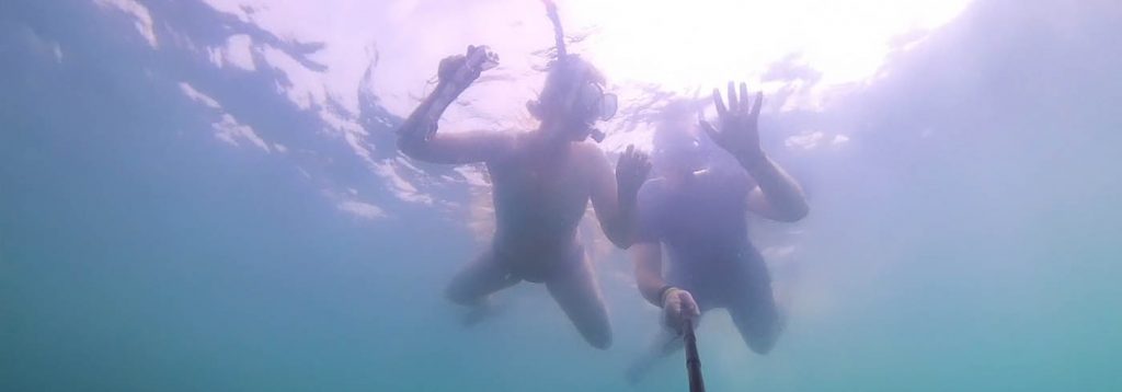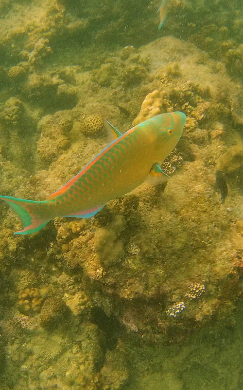 Wir haben unsere Masken und Schnorchel aufgesetzt, die Wertsachen in den Drybag gepackt und die Unterwasserkameras angeschnallt. Wir stürzten uns in die Wellen und schon nach wenigen Metern endete der Strand und die Korallenwelt begann. Unglaublich, was es nur 1-2 Meter unter den badenden Touristen zu sehen gibt! Korallen und jede Menge Fischarten. Für mich war es fast so schön wie beim Tauchen. Natürlich muss man hier an der Wasseroberfläche bleiben und darf nicht abtauchen, sonst läuft einem das Wasser in den Schnorchel (ist uns beiden anfangs ein paar Mal passiert). Wir haben trotzdem so viel gesehen! Es gab fast so viele Fischarten zu bestaunen, wie bei unseren Tauchausflügen. Alle wunderschön und bunt. An den beiden Enden der Bucht lagen große Felsen im Wasser. Dort wuchsen jede Menge Korallen und es waren viele kleine Fischgruppen unterwegs.