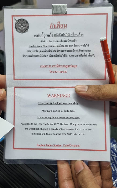 Abends sind wir mit unserem Roller ins Zentrum zum Abendessen gefahren. Wir parkten unseren Roller im Ort am Straßenrand neben anderen Fahrzeugen. Das Abendessen war sehr lecker und wir sind zufrieden und satt zu unserem Parkplatz zurückgelaufen. Dort stellten wir leider fest, dass jemand eine dicke Kette mit Schloss um unser Vorderrad gelegt hatte. Ein großer einlaminierter Strafzettel klebte vorne am Roller. Darauf stand, wir hätten das Fahrzeug in einem verbotenen Bereich geparkt und müssten nun 600 Baht Strafe zahlen. Auf der Rückseite des Zettels war ein QR Code mit dem Standort der nächsten Polizeistation. Sie lag 20 Minuten zu Fuß entfernt. Unsere Laune sank ziemlich schnell in den Keller und wir witterten hier eine große Touristenabzocke, zumal unser Roller (der deutlich als Mietroller gekennzeichnet ist), der einzige war, der einen Strafzettel bekommen hatte. Alle anderen Roller neben uns hatten keinen. Wir stampften also los und regten uns auf unserm 20 minütigen Marsch ordentlich auf. An der Polizeistation angekommen, bei der es sich um eine Wellblechhütte handelte, hatte sich Chris schon wieder halbwegs abreagiert. Ich war allerdings noch ziemlich sauer und fing an, mit den Polizisten zu diskutieren. Anschließend haben wir statt 600 nur 500 Baht bezahlt. Nach der Bezahlung sollten wir zurück zum Roller laufen und dort würde dann jemand kommen und die Kette aufschließen. Als wir die Station verließen, stand dort schon das nächste Touristenpaar vor der Tür. Ihnen war genau das Gleiche wie uns passiert. Daraufhin wurde ich dann nochmal ziemlich sauer, weil ich mir echt verarscht vorkam.