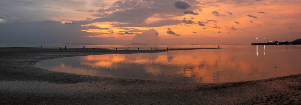 Heute haben wir einen entspannten Ausflug auf die Westseite der Insel gemacht. Wir sind zum „Lipa Noi“ Strand gefahren. Ein wirklich schöner Ort mit Palmen, die über dem weißen Sandstrand hängen. Wie man es sich in seiner tropischen Fantasie vorstellt! Wir sind ein bisschen am Strand entlanggelaufen und wollten uns dort anschließend noch den Sonnenuntergang ansehen. Leider zog der Horizont gegen Abend ziemlich zu und die Sonne verschwand hinter dicken Wolken. Wir dachten, dass man nichts vom Sonnenuntergang sehen würde und machten uns auf den Heimweg. Als wir auf der Fahrt beim Pier vorbei kamen, bekamen wir dann doch noch genau den Sonnenuntergang, den wir uns gewünscht hatten: Ein wunderschöner, pinker Himmel, der sich ganz toll in der flachen Bucht des Hafens spiegelte. Wir machten noch ein paar Fotos und fuhren dann im Dunklen zurück zur Unterkunft. Anschließend gab es noch ein leckeres Abendessen bei uns in der Gegend, diesmal ohne Parkplatzprobleme 😉