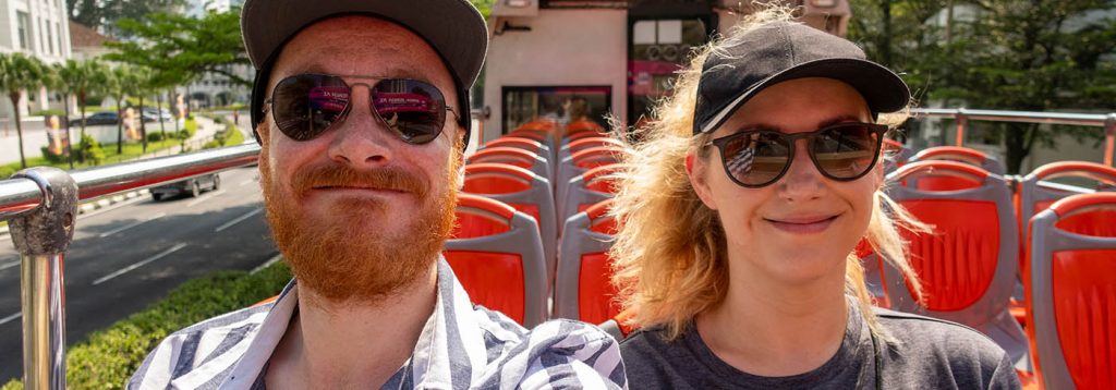 Wir waren heute beide irgendwie genervt. Chris hat schlecht geschlafen und ich hab mir irgendwas im Nacken eingeklemmt und konnte meinen Kopf kaum drehen. Die Hitze draußen und die extrem herunter gekühlten Innenräume sind glaube ich ein zu heftiger Kontrast für uns. Entweder schwitzt man sehr oder man friert. Dazwischen gibts eigentlich nichts. Nur in unserem Hotelzimmer ist es angenehm, dort haben wir die Klimaanlage gar nicht erst eingeschaltet und somit sowas wie eine normale Zimmertemperatur. Wir haben uns heute für einen Hop on hop off Bus entschieden. Ein Doppeldeckerbus mit offenem Verdeck, der dich durch die Stadt zu allen wichtigen Sehenswürdigkeiten fährt. Bei jedem Halt kann man mit seinem Ticket dann zu oder aussteigen. Super Idee und zu Fuß würden wir das alles sowieso nicht schaffen. Wir sind also zum Busterminal gelaufen (war nur 12 Minuten von uns entfernt). Dort ist uns leider der erste Bus während des Ticketkaufs vor der Nase davongefahren. Wir mussten 40 Minuten auf den nächsten warten. Ich glaube, heute war der bisher heißeste Tag, denn es war keine Wolke am Himmel zu sehen. In der direkten Sonne ist es eigentlich kaum auszuhalten. Das merkten wir dann auch, als endlich der Bus kam und wir uns im oberen Stockwerk im Außenbereich hinsetzten. Wir standen ca. 15 Minuten, bevor der Bus losfuhr. In der Zeit wurden wir quasi gegrillt und sind fast mit den Plastiksitzen verschmolzen. Immerhin waren wir beide so schlau, Caps aufzusetzen. Die anderen Touristen ohne Kopfbedeckung fingen recht schnell an die Fahrpläne, Handtaschen und Regenschirme auszupacken und über die Köpfe zu halten.
