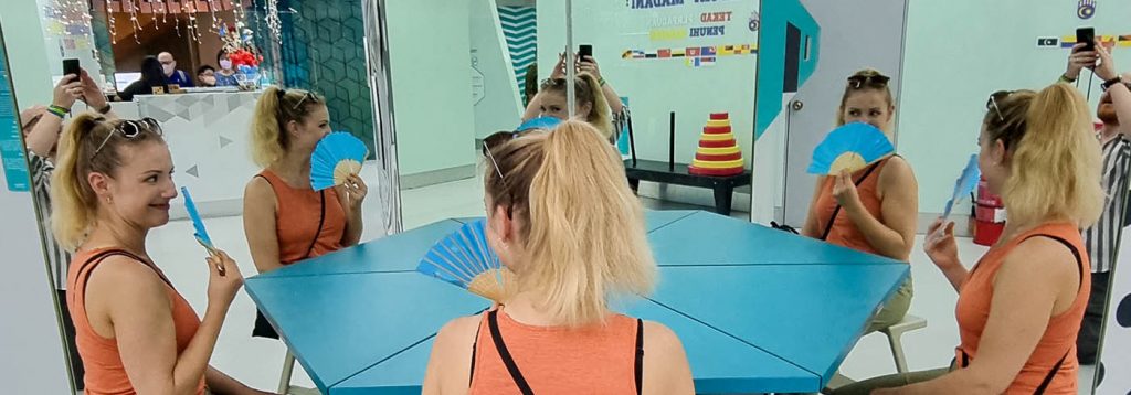Nach der Hitze und dem vielen Laufen wollten wir es heute mal ruhiger angehen. Nach dem Frühstück sind wir ins Museum of Illusions. Leider hat sich der Besuch nicht so richtig gelohnt. Es war viel kleiner als Erwartet, die begehbaren Illusionen nicht ganz ausgereift und der Rest bestand eigentlich nur aus kniffligen Holzspielzeugen. Immerhin klimatisiert und nicht in der prallen Sonne. Die umgerechnet 10 Euro pro Person waren allerdings recht überteuert. Anschließend haben wir im Hotelzimmer ein bisschen relaxt und uns um die nächsten Buchungen für Japan gekümmert. Zum Abendessen ging es nochmal raus. Da war Chris dann zum ersten Mal seit wir unterwegs sind enttäuscht vom Essen. Er hatte zu seinem Reisgericht statt fried Chicken fried Mushrooms bestellt und die waren anscheinend dermaßen zäh und wie ne Gummisohle, dass er sie nicht essen konnte. Tja, kann einem eben auch hier passieren. Ich glaube ich habe gestern doch zuviel Sonne abbekommen. Der Sonnenbrand auf meinem Scheitel leuchtet mir im Bad sehr rot entgegen und ich hab auch ziemliche Kopfschmerzen und fühle mich schlapp! Wir sind hier aber abends immer total erledigt und fallen nur noch ins Bett! Ich frage mich, ob man sich irgendwann an das Klima gewöhnt, oder ob wir das immer so spüren werden.