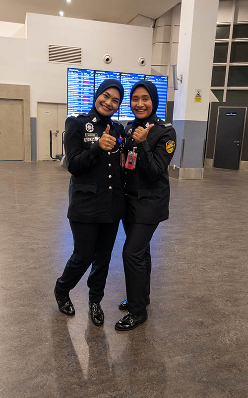 Als wir unsere Rucksäcke aufgegeben hatten und mit unserem Handgepäck Richtung Security Check wollten, gab es dann zum ersten Mal ein Problem mit Chris Reisegitarre. Der Herr am Durchlass meinte man dürfe nur ein Handgepäcksstück mitnehmen (sollte dort auch noch vorab gewogen werden) und Instrumente wären an Bord auch nicht erlaubt. Als Chris darauf hinwies das wir mit der gleichen Fluglinie (AirAsia) bereits ohne Probleme ins Land gekommen wären, meinte der Mitarbeiter nur, dass das von außerhalb ja so sein kann, aber nicht wenn wir von hier starten. Schöner Mist! Die Gitarre hat nur ein dünnes Softcase und ist nicht wirklich dafür gemacht, aufgegeben zu werden. Bei den Verpackstationen konnte uns auch nicht wirklich geholfen werden. Dort wird nur in Folie gewickelt aber sonst nichts verpackt bzw. gesichert. Wir haben also alles aus dem Handgepäck geräumt was irgendwie als Polsterung fungieren könnte und um die Gitarre gewickelt und gebetet, dass sie den Flug übersteht. Chris ging zurück zum Gepäckaufgabeschalter, als eine Angestellte ihn auf die Gitarre ansprach. Anscheinend darf man sie in einem Softcase auch nicht aufgeben! Sie klemmte sich an ihr Walkie Talkie und marschierte mit uns wieder zurück zum Durchlass zur Security. Sie sprach kurz mit dem Mann, der uns anfangs nicht durchlassen wollte und auf einmal war alles gar kein Problem mehr. Nicht mal unser Hangepäck wurde gewogen (zum Glück, denn Chris Kamerarucksack wiegt sicher mehr als 8 Kilo!) geschweige denn auf unsere Boardingpässe geschaut. Super nett und freundlich wurde uns noch ein schöner Flug gewünscht und durch waren wir! 😀 keine Ahnung wieso, aber anscheinend haben hier Frauen dann doch ab und zu das sagen.