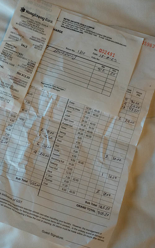 Apropos dazulernen: Wir haben bis jetzt einmal Wäsche gewaschen. In Sri Lanka wurde das bei unserer Unterkunft in Talalla mit angeboten (sehr günstig). Leider war das Ergebnis nicht so toll. Die Flecken waren immer noch drin und so richtig trocken wurde das Ganze bei dem Klima scheinbar auch nicht. Jedes Mal, wenn wir unsere Kompressionsbeutel geöffnet haben, roch es nach muffiger Wäsche. Wir wollten unsere Wäsche nochmal hier waschen. In unserem Hotel gab es einen entsprechenden Service und wie teuer kann sowas schon in einem Land wie Kuala Lumpur sein? Wie sich herausstellte, war es ziemlich teuer! Umgerechnet 70 Euro haben wir fürs Waschen bezahlt! Selbst Schuld, wenn man vorher nicht nach dem Preis fragt! Oh Mann! Immerhin duftet alles super und ist schön gebügelt. Morgen gibt es nur günstiges Abendessen an einem Imbissstand! Irgendwie müssen wir Geld ja wieder reinholen 😉