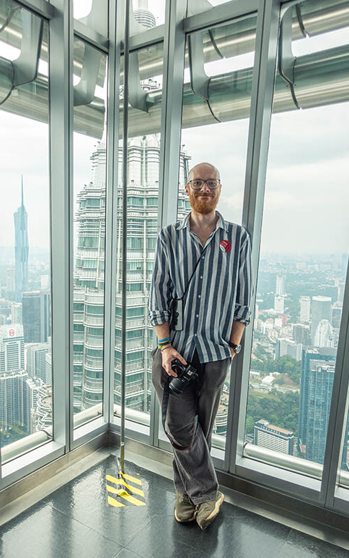 Abend kam dann noch das Highlight unseres Aufenthalts! Chris hatte schon am ersten Tag die Besichtigung der Petronas Towers gebucht (es gibt Timeslots und die Karten waren sehr schnell ausverkauft). Der erste Stopp war im 41 Stock auf 170 Metern. Hier sind die beiden Türme mit einer Glasbrücke verbunden. Diese ist übrigens nicht fest mit den Gbäuden verbunden sondern dank einer speziellen Konstruktion frei schwebend mit den Türmen fixiert. Dadurch kann sie genauso wie die Türme bei Wind oder Beben nachgeben. Darüber denkt man lieber nicht so genau nach beim drüberlaufen! Wobei man bei den massiven Stahl- und Glaskonstuktionen nicht wirklich glauben kann, dass da irgendetwas wackeln würde. Selbst der höhenängstliche Chris lief ganz lässig hin und her. Anschließend ging es dann noch hinauf in den 86. Stock. Der Aufzug hinauf fährt auch recht zügig und man musste ständig den Druck auf den Ohren ausgleichen. Hier ist man immerhin schon 370 Meter hoch! Der Ausblick von hier oben ist echt nicht zu verachten!Man kann zum Zwillingsturm hinübersehen und natürlich ein paar tolle Fotos schießen.