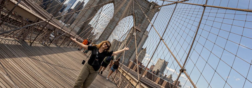 Zweiter Tag in New York City. Wir fuhren heute vom Busterminal mit der U-Bahn nach Brooklyn. Der Stadtteil DUMBO (steht übrigens für Down Under the Manhattan Bridge Overpass) ist geprägt von Lagerhäusern aus Backstein und Straßen aus Kopfsteinpflaster. An der Uferpromenade hatten wir einen großartigen Blick auf die Skyline von Manhattan. Von hier aus kann man auf einem angelegten Fußweg über die Brooklyn Bridge bis nach Manhattan laufen. Knapp 1,5 Stunden schlenderten wir bei schönstem Sonnenschein mit vielen anderen Menschen über die Brücke. Tolle Fotomotive gab es alle paar Meter. Ein super Start in den Tag, der obendrein auch noch kostenlos war!