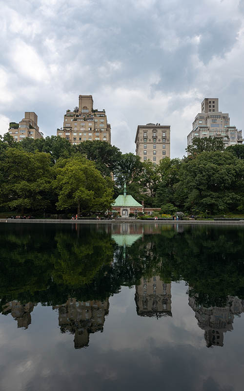 Heute morgen ging es mir besser als gestern und ich wollte den letzten Tag in New York auf keinen Fall im Bett verbringen. Die wichtigsten Gebäude haben wir ja schon gesehen, doch der Central Park fehlte uns unbedingt noch. Mit Medikamenten und Nasenspray bewaffnet, marschierten wir zum Bus und fuhren ein letztes Mal in die Stadt. Wir liefen die 8th Avenue entlang bis zum Central Park und schlenderten dort über die vielen angelegten Pfade. Ein unglaublich großer und wunderschöner Park, den sich die New Yorker dort geschaffen und bewahrt haben. Große Bäume und riesige Rasenflächen bieten genug Platz für tausende von Menschen und Tieren. Hier herrscht tatsächlich mal Ruhe in der sonst so lauten und vollen Stadt. Für uns heute genau das Richtige. Das Wetter war sehr drückend und fühlte sich nach Gewitter an. Wir steuerten auf das Zentrum des Parks zu, dort liegt das Belvedere Castle. Das kleine Schloss von 1872 liegt auf dem Vista Rock, dem zweithöchsten Hügel des Central Parks. Von dort hat man eine tolle Aussicht auf das Gelände und die schicken Hochhäuser der 5th Avenue. Hier legten wir eine kleine Pause ein, denn wir schwitzten heute bei dem schwülen Wetter sehr viel.