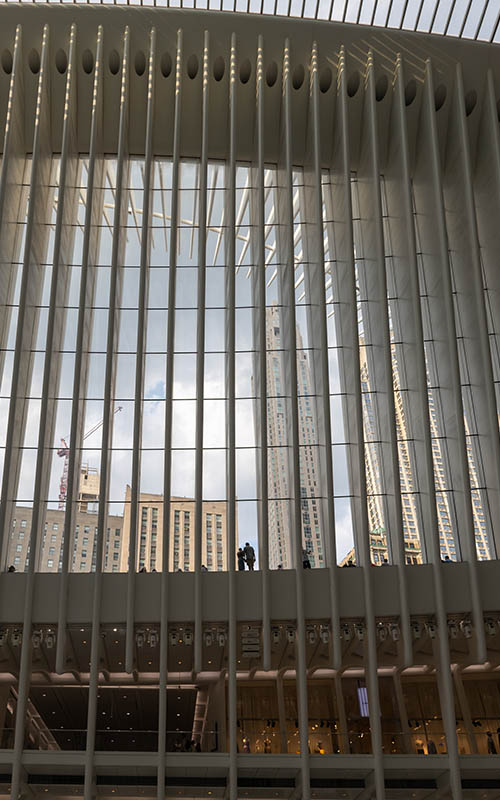 Wir genossen die restliche Fährfahrt und kamen gegen späten Nachmittag wieder in Manhattan an. Dort machten wir uns nach einer kleinen Stärkung auf zum World Trade Center Memorial. An den Einsturz der Twin Towers können wir uns beide noch erinnern, auch wenn es mittlerweile schon fast 23 Jahre her ist. Es war toll zu sehen, was hier in den letzten Jahren entstanden ist. Vor 17 Jahren blickte ich noch in die Baugrube des mittlerweile stehenden One World Trade Center. Der gigantische Wolkenkratzer verschmilzt mit seiner Glasoberfläche förmlich mit den Himmel. Auch die 9/11 Memorial Brunnen sind toll gemacht. Die eingravierten Namen erinnern an alle Opfer dieses tragischen Tages. Das Oculus World Trade Center hat uns auch sehr beeindruckt. Der moderne weiße Bau mit gewölbter Decke, der mich an eine Walfischflosse erinnert, bietet neben Architektur auch noch eine riesige Shoppingmall und den Zugang zu sämtlichen U-Bahnlinien. Hier stiegen wir auch wieder ein und fuhren zurück zum Busterminal. Die Zeit scheint in New York schneller vorbei zu gehen, als anderswo. So endete ein weiterer ereignisreicher Tag in dieser tollen Stadt.