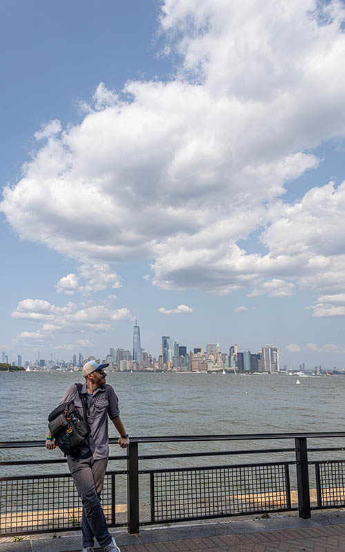 Wir sind beide keine großen Fans davon, zwischen lauter schwitzenden Fremden eingeklemmt zu werden. Mit etwas Organisation hätte das Ganze viel zivilisierter und kontrollierter ablaufen können. Aber außer um zu checken, ob jeder schön sein Ticket bezahlt hatte, kümmerte sich sonst niemand. Im Security-Häuschen wurde Chris‘ Kamerarucksack stärker gefilzt als an jedem bisherigen Flughafen. Endlich an Bord, standen wir auch dort wieder dicht gedrängt mit der ganzen Meute und hatten mittlerweile schon gar keine Lust mehr auf die Tour. Leider, leider müssen wir feststellen, dass viele Attraktionen in New York zu teuer, unorganisiert und damit nervig sind. Zu vielen Menschen wird hier das gleiche verkauft und dann werden die Horden sich selbst überlassen. Hauptsache Geld verdient, egal ob dann noch irgend jemand Spaß dran hat. Das haben wir in anderen Metropolen deutlich besser organisiert gesehen. Heute auf dem Boot ist deshalb auch unser Entschluss gefallen, für die nächsten Tage nichts mehr zu buchen und keine weiteren überteuerten Eintritte mehr zu zahlen. Die Überfahrt zur Freiheitsstatue selbst dauerte nur wenige Minuten. Die Aussicht war toll und bei strahlendem Sonnenschein stiegen wir auf „Liberty Island“ aus.