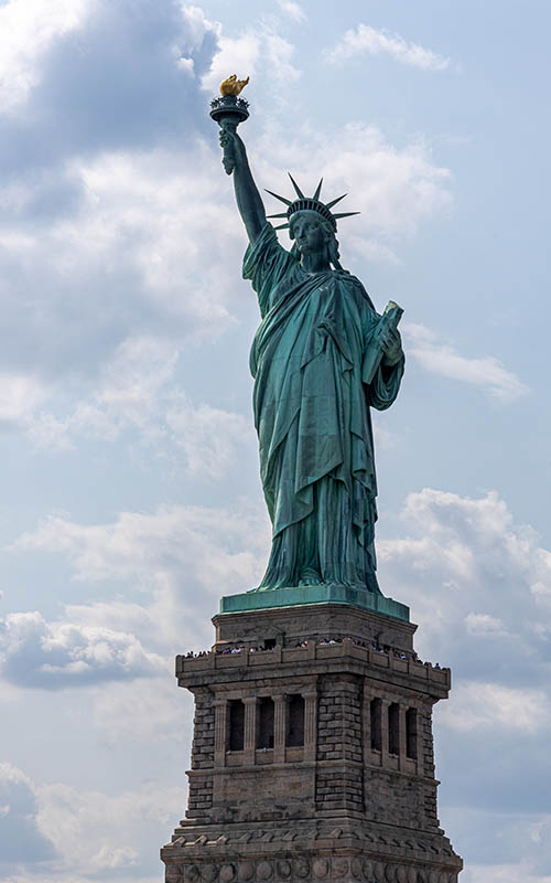 Die kleine, unbewohnte Insel ist seit 1886 Heimat der Freiheitsstatue. Die konnten wir uns von einem angelegten Rundweg um die Insel auch mal aus nächster (ca. 30 Meter entfernt) Nähe und von unten ansehen. Ein Besuch des Sockels oder des Inneren der Statue hätte selbstverständlich nochmal extra gekostet. Uns reichte die Außenansicht völlig, denn schließlich ging es ja um die Statue! Ein kleines, kostenloses Museum auf der Inselrückseite zeigte die Entstehungsgeschichte der Statue of Liberty und maßstabsgetreue Größenvergleiche, z.B. des Gesichtes. Auch die alte Fackel von 1885, die damals noch verglast und von innen beleuchtet wurde, ist dort ausgestellt. Seit 1986 hält sie die vergoldete Fackel in der Hand. Nach einer Reihe von Fotos mussten wir uns auch schon wieder anstellen, um auf die nächste Fähre zu kommen. Dieses Mal ging es glücklicherweise schneller und ohne lange Wartezeit. An Ellis Island fuhren wir nur vorbei. Ein Ausstieg hätte auch einen kostenpflichtigen Eintritt im Museum bedeutet und darauf hatten wir heute keine Lust mehr.