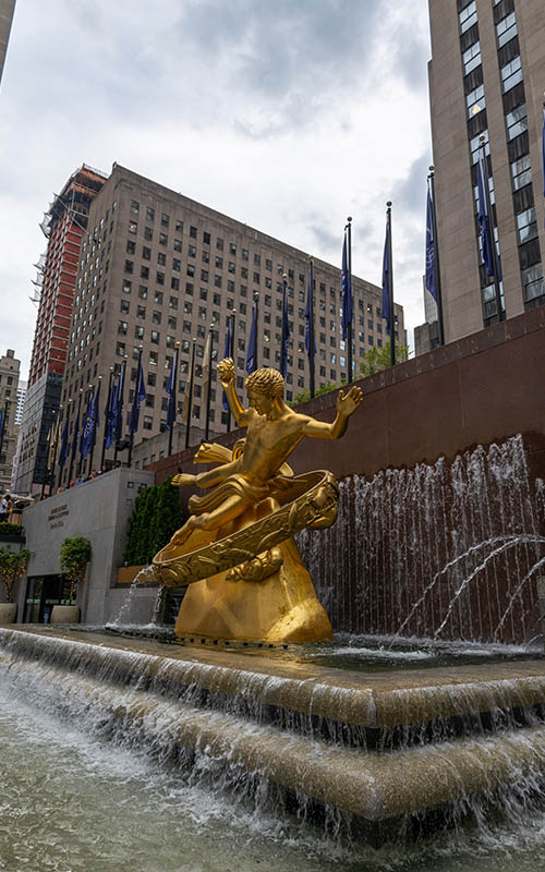 Zurück in der Stadt erkundeten wir das Viertel der Wallstreet. Natürlich besuchten wir neben dem New York Stock Exchange auch den ikonischen Bullen. Den sah man allerdings vor lauter Touristen kaum. Es war so voll, dass wir auf ein persönliches Foto mit Stier verzichteten und lieber weiter gingen. Nach einer Pause mit leckerem vietnamesischen Essen ging es zum Time Square. An diesem quirligen Hotspot herrscht wohl das lauteste und bunteste Treiben der Stadt. Gesehen haben muss man ihn aber natürlich auf jeden Fall. Kurz vor Sonnenuntergang hatten wir uns für stolze 120 Dollar einen Ausblick vom Rockefeller Center gebucht. Günstiger wären die anderen Hochhäuser der Stadt auch nicht gewesen und einen Ausblick über New York wollten wir unbedingt haben. Bis wir hoch durften, verbrachten wir die Zeit noch um das Rockefeller Center herum. Neben dem Prometheus Brunnen gibt es dort auch das Kaufhaus FAO Schwarz. Den Spielzeugladen hatte ich von vor 17 Jahren noch als Highlight in Erinnerung. Der heutige Besuch war etwas ernüchternd. Verkäufer stellen dort mittlerweile, mit Mikrofonen und Lautsprechern ausgestattet, die neuesten Spielsachen vor. Die Gänge waren super eng und alles war vollgestopft. Weniger Charme, dafür mehr Marktschreier. Für mich sehr enttäuschend. Ich hätte den Laden lieber von damals in Erinnerung behalten sollen.
