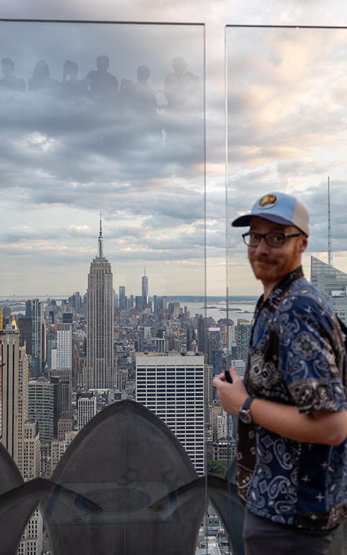 Überpünktlich waren wir zu unserem Zeitslot am Eingang zum 30 Rock und wurden dort wegen „7 Minuten zu früh“ recht unhöflich wieder weggeschickt. Als wir dann endlich im Gebäude waren, gab es erst einmal wieder einen patriotischen Kinofilm über das Rockefeller Center, den man sich anschauen musste. Bis wir dann schließlich wirklich in den Aufzug und auf das Aussichtsdeck kamen, dauerte es eine Weile. Oben angekommen gleich die Ernüchterung. Es gab drei kleine Aussichtsdecks. Die Hälfte davon war mit Bauzaun zugestellt. Ein Drittel davon nur für VIP Gäste, die gegen Aufpreis auf einem Stahlträger sitzen und sich fotografieren lassen konnten. Auch dieser Bereich war großflächig abgesperrt. Die wenigen freien Flächen mit Blick auf die Stadt, die dann noch übrig waren, waren bereits von hunderten Touristen belagert. Man bucht zwar einen Zeitslot, um aufs Dach zu kommen, kann dann aber anscheinend so lange bleiben, wie man möchte. Gut, dass wir Idioten noch 15 Dollar mehr pro Person für den Sunset Slot bezahlt hatten.