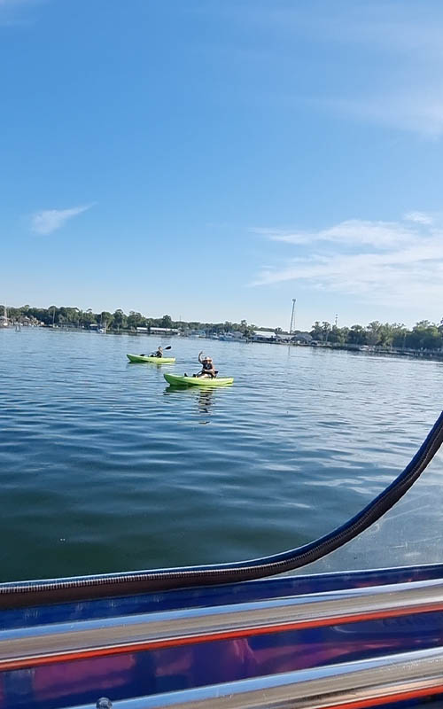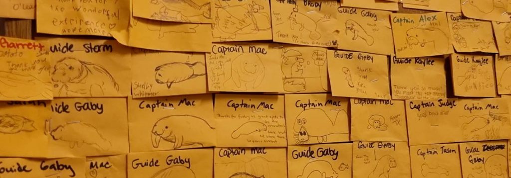 Wir sind heute schon um 5 Uhr früh aufgestanden, um gegen 8 Uhr beim „Manatee-Schnorcheln“ zu sein. „Free 2 Dive“ bietet Bootsausflüge mit einem Schnorcheltrip im Crystal River an. Nachdem wir mit Neoprenanzügen ausgestattet waren, fuhr unser Guide Gabby uns und die anderen 9 Besucher zum Hafen. Dort trafen wir auf unseren lustigen Kapitän, der uns durch den Fluss schipperte. Wir sind leider nicht zur Manatee High Season hier, denn die ist erst im Winter. Dann versammeln sich hier im Fluss mehrere hundert Tiere. Es gibt aber einige wenige Dauergäste, die man das ganze Jahr antreffen kann. Im Moment muss man mehr nach ihnen suchen, als im Winter. Sehkühe tauchen alle paar Minuten zum Luftholen auf, also hielten wir alle die Augen offen und hofften auf eine Wasserbewegung, eine sichtbare Schnauze, oder ein Blasgeräusch. Der erste Gang ins Wasser blieb leider erfolglos.