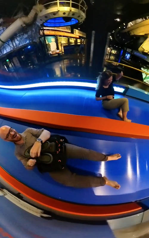 Am heutigen Montag war auch deutlich weniger los als noch am Samstag und so gab es kaum Andrang oder Wartezeiten. Im Anschluss landeten wir noch Sonden und dockten Teleskope an Simulationsgeräten an. Auf allen Vieren krabbelte ich durch die schmalen Gänge der ISS und fühlte mich wieder wie ein Kind auf dem Spielplatz. Um die obere Ebene zu verlassen, konnte man entweder eine Etage tiefer laufen, oder rutschen. Natürlich haben wir uns für die Rutsche entschieden!