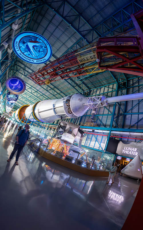 Alleine die Busfahrt über das Fertigungsgelände und der anschließende Besuch des „Saturn 5 Centers“ dauerte schon 2,5 Stunden. Im Center gab es alles zu den Apollo Missionen zu sehen. Von den ersten Flügen zum Mond, über gescheiterte Missionen, gab es Ausstellungen in verschiedenen Räumen und dazu Filme mit historischem Filmmaterial aus der Zeit. Neben Raumanzügen, Mondgestein und Raumsonden war die Saturn 5 Rakete der eigentliche Blickfang. Die 110 Meter lange Rakete hing unter dem Dach der Halle und war in ihre einzelnen Stufen aufgeteilt zu sehen. Sehr beeindruckend, eine Rakete dieser Größe „in echt“ zu sehen.