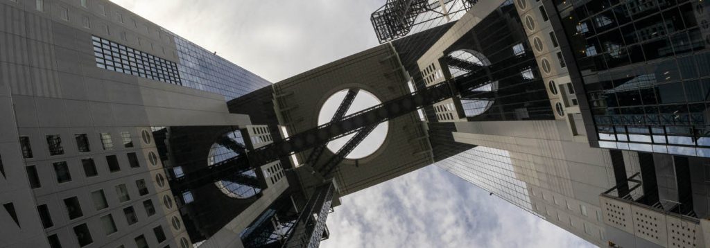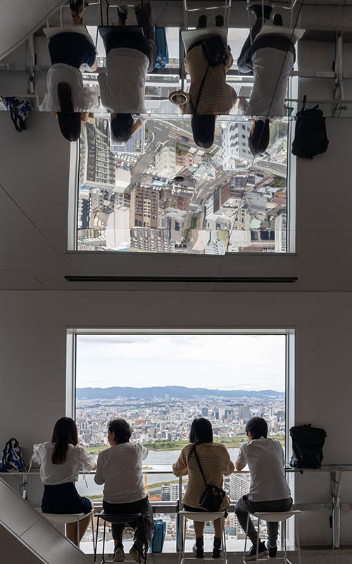 Weiter ging es zum Umeda Sky Building (auch Kuchu Teien Observatory genannt) – ein Hochhaus bestehend aus zwei Türmen im Norden Osakas. In 170 Metern Höhe gibt es eine begehbare Aussichtsplattform mit 360 Grad Ausblick. Das Gebäude selbst ist schon spektakulär. Die Rolltreppen, die ganz nach oben führen sind über Brücken miteinander verbunden. Die Plattform hat ein Loch in der Mitte und besteht komplett aus Glas und Stahl.