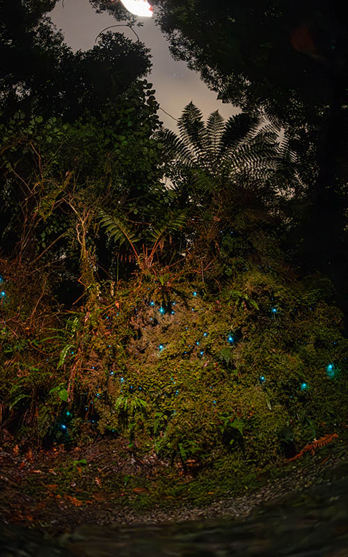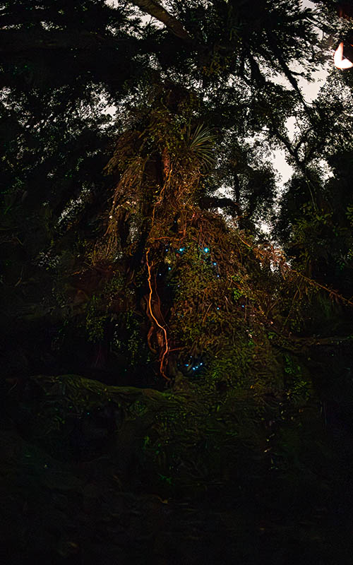 Bei leichtem Regen gingen wir los. Schon nach wenigen Minuten sahen wir das erste Leuchten. Im Wald war es stockfinster und die Augen mussten sich erst an die Dunkelheit gewöhnen. Mit unseren Handys verfolgten wir den Pfad und kamen immer tiefer in den Wald. Die leuchtenden Pünktchen sahen aus wie der Sternenhimmel. Je länger wir still standen und uns umsahen, desto mehr Glühwürmchen entdeckten wir. Auch hier waren wir nicht alleine. Mit uns waren einige Touristen unterwegs, die auch das leuchtende Spektakel sehen wollten. Obwohl sie nur schwach leuchten, konnte Chris sie fotografieren. Ein tolles Erlebnis, das ein bisschen an den Wald in „Avatar“ erinnerte. Dieser Ausflug hat sich nochmal richtig gelohnt. Als wir zum Ausgang liefen, kam uns eine riesige Gruppe lautstarker chinesischer Touristen entgegen. Wir waren froh, noch rechtzeitig vor Ort gewesen zu sein. Gerade hier in der Gegend um die Gletscher sind sehr viele Touristen unterwegs. So einsam und abgeschieden wie wir dachten, ist die Südinsel Neuseelands dann wohl doch nicht.