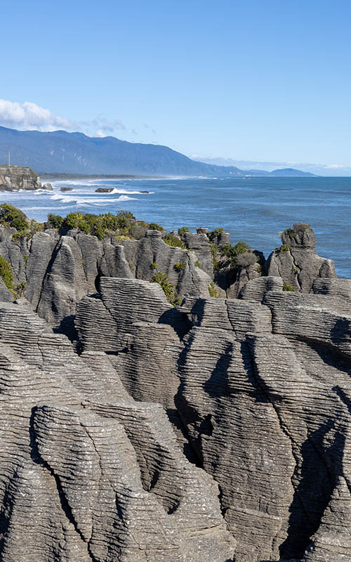 Heute stand uns eine lange Fahrt Richtung Süden bevor. Unser Ziel: die neuseeländischen Alpen. Unsere nächste Unterkunft liegt in der Nähe des „Fox Glacier“. 7 Stunden Autofahrt zogen sich heute extrem lange hin. Den Großteil der Strecke fuhren wir auf engen, kurvigen Straßen, die immer wieder bergauf und anschließend bergab führten. Von Tunneln durch den Berg hat man hier anscheinend noch nie etwas gehört. Dank enger Haarnadelkurven und starken Steigungen muss man die meiste Zeit langsam fahren und kommt kaum voran. Um die lange Fahrt ein wenig zu entzerren, hielten wir unterwegs noch bei den „Pancake Rocks“. Den Namen verdanken die Felsformationen ihrem Aussehen. Waagerechte Rillen im Gestein erinnerten viele Besucher an übereinander gestapelte Pfannkuchen. Ein 20 minütiger Rundweg führte uns an den vielen Felsen vorbei.