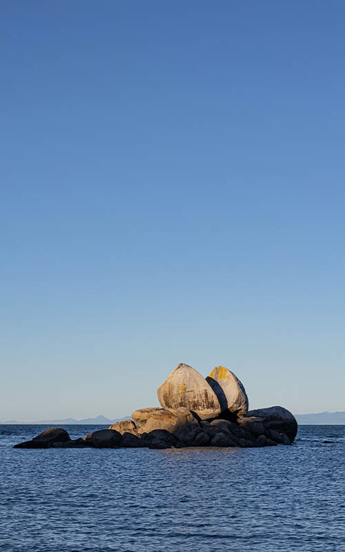 Zum Schluss besuchten wir noch den sog. „Split Apple Rock“, eine rundliche Felsformation, die in der Mitte gespalten ist und so wie ein halbierter Apfel aussieht. Um dorthin zu gelangen, mussten wir noch einige Serpentinen überwinden und nach einer verwirrenden bzw. kaum vorhandenen Beschilderung fanden wir schließlich doch noch den Parkplatz und den Zugang zum Strand. Da in dieser Gegend so ziemlich alles in Privatbesitz ist, hat man keine Möglichkeit, von der Straße aus das Meer zu sehen. Entweder verstellen hohe Bäume die Sicht, oder Privatzufahrten verhindern den Zugang. Komisch, dass in einem Land, in dem angeblich so wenige Menschen leben, doch jeder Quadratmeter irgend jemandem zu gehören scheint. Der schmale Abgang zum Strand lag zwischen zwei riesigen Privatgrundstücken. Viele steile Treppenstufen führten uns hinab zur Tasman Bay. Dort liegt der „Apfel“ nur wenige Meter vom Strand entfernt. Wir hatten super Timing und erwischten ihn noch in der untergehenden Sonne. Wer den steilen Weg zum Strand hinunter und zurück nicht bewältigen kann, kommt nicht in den Genuss der Aussicht.