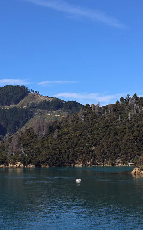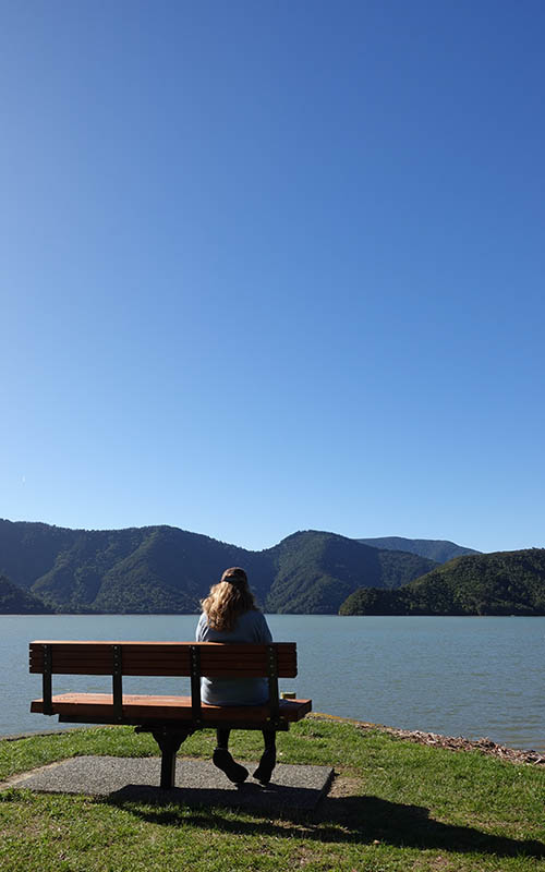 Wir blieben an Board selbst in den Innenräumen in alle Schichten gehüllt, denn warm war es nirgendwo. Gegen 10 Uhr kam die Sonne raus und wir gingen nochmal nach draußen. Auf dem hinteren Deck fanden wir einen windgeschützten Platz in der Sonne. Je näher wir der Südinsel kamen, desto schöner wurde der Ausblick. Wir fuhren durch die Meerenge der Cook Straße und hatten eine spektakuläre Sicht auf die bergige Landschaft. Gegen Mittag kamen wir in Picton an. Dort gingen wir noch etwas Essen, da wir erst gegen 16 Uhr in die neue Unterkunft einchecken konnten. Die Fahrt zu unserer nächsten Unterkunft dauerte 3,5 Stunden und führte uns durchs Gebirge. Wie gern hätten wir angehalten und Fotos gemacht! Leider ist das ein riesen Manko in Neuseeland. Schon auf der Nordinsel fiel uns auf, dass es kaum Haltemöglichkeiten an der Straße gibt. Auch Ausblicke sucht man vergeblich, da man nirgends halten kann, um ein Foto zu machen. Die Aufnahmen, die wir bis jetzt haben, sind alle nur durch die Drohne entstanden. Wir selbst hätten davon nichts gesehen. Drohnen sind im Land allerdings so ziemlich überall verboten.