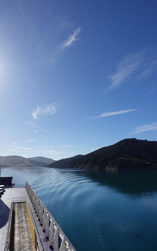 Der Tag startete für uns sehr früh! Wir standen um 5:30 Uhr auf und fuhren zum Hafen. Gegen 7 Uhr ging es auf die Autofähre zur Südinsel. An Deck gab es einen großen Aufenthaltsbereich mit Cafe für die 3,5 stündige Überfahrt. Die ersten 1,5 Stunden waren eher unspektakulär, da man außer offenem Meer nicht viel sehen konnte. Draußen war es windig und sehr kalt, deswegen hielten wir uns im Cafe auf. Wir waren beide ziemlich durchgefroren und übernächtigt. In unserer Unterkunft war es am Morgen kälter gewesen als draußen. Ich trug ein T- Shirt, einen Merinopulli, meine dicke Fleecejacke und die Regenjacke darüber. Zusätzlich zwei paar Socken, die Regenhose über der normalen Hose, Halstuch und eine Mütze. Mit dem Heizen scheinen die Neuseeländer eher sparsam zu sein.