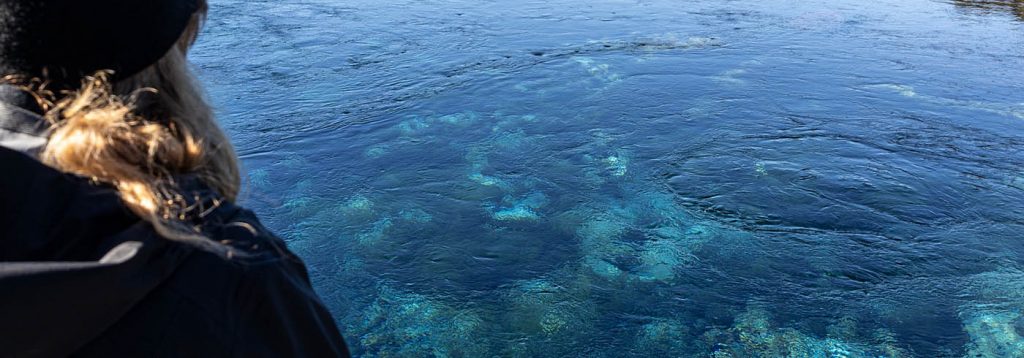 Nach dem Irrgarten fuhren wir weiter Richtung Küste. Die Fahrt war extrem kurvig und ging viele Höhenmeter bergauf – und ab. Mein immer noch etwas steifer Nacken fand die Serpentinen nicht so toll, aber es war aushaltbar. Dafür hatten wir vom Berg aus einen schönen Ausblick ins Tal. Unser nächster Stopp waren die „Te Waikoropupu Springs“. Diese Quellen an der Küste der Golden Bay sind für ihr klares Wasser bekannt. Ein schöner Pfad durch den Wald führte uns zu den Quellen. Über angelegte Holzstege konnte man durch das kristallklare Wasser bis zum Grund sehen. Der weiße, sandige Boden hat mehrere Schlote, aus denen ununterbrochen frisches Wasser ausgestoßen wird. 14.000 Liter Wasser treten hier pro Sekunde aus. Das Wasser ist wunderschön türkis und die Pflanzen sehen aus wie aus einem Fantasy Film. Dieser Besuch hat sich voll gelohnt.