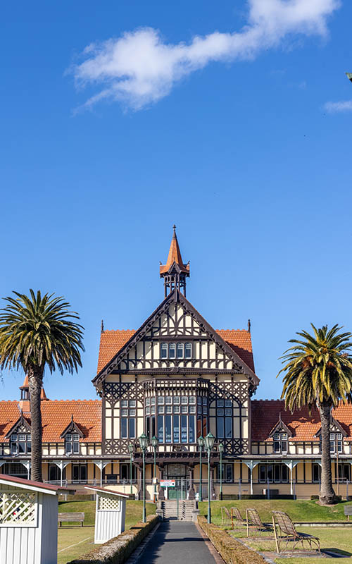 Unser heutiger Ausflug ging zu den „Government Gardens“ in Rotorua. Der öffentliche Park gilt als Touristenmagnet in der Region. Neben schönen Grünanlagen und Spielmöglichkeiten für Kinder, gibt es auch historische Gebäude auf dem Gelände. Das „Bath House“ wurde 1908 eröffnet und ist ein echter Blickfang in der Mitte des Parks. Das zum Großteil aus Holz erbaute Gebäude im elisabethanischen Stil wurde bis in die sechziger Jahre von der Bevölkerung als Badehaus genutzt. Nach Restaurierungen ist es seit den Neunzigern ein Museum. Leider hatte es bei unserem Besuch geschlossen und so konnten wir es nur von außen bestaunen. Ganz in der Nähe steht das „Blue Baths“, ein Badehaus im spanischen Missionarsstil. Dieses zweite Badehaus wurde 1933 eröffnet, als das gemeinsame Baden von Frauen und Männern als „unangebracht“ angesehen wurde. Seit den achtziger Jahren ist es ebenfalls geschlossen.